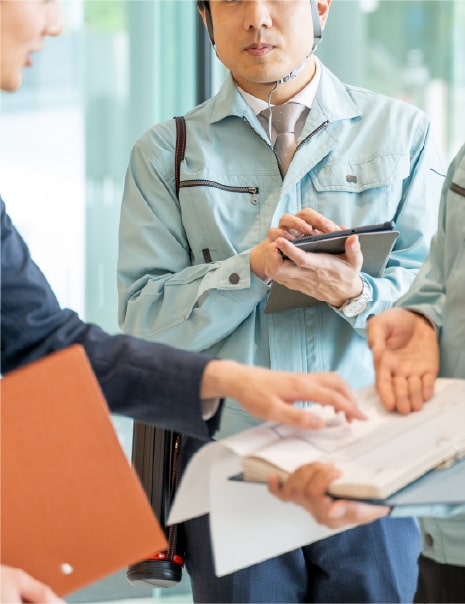 設計図書の事前検討を厳密に行い、より効率的で安全に工事を進めます。お客様にはサンプルやカタログ、図面等により進捗状況をご確認いただきながら施工を行います。